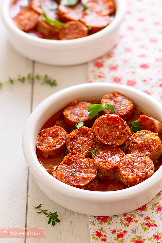 - Una vez transcurrido el tiempo cortamos los chorizos en rodajas y los servimos con la salsa.