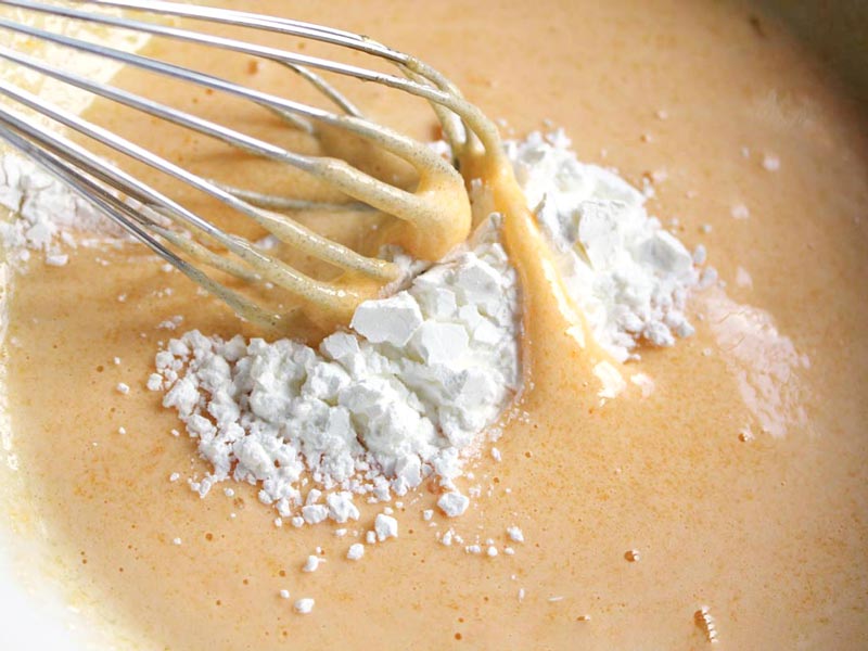- Añadimos los 40 g de harina de maíz (maicena) al bol con las yemas y el azúcar.
