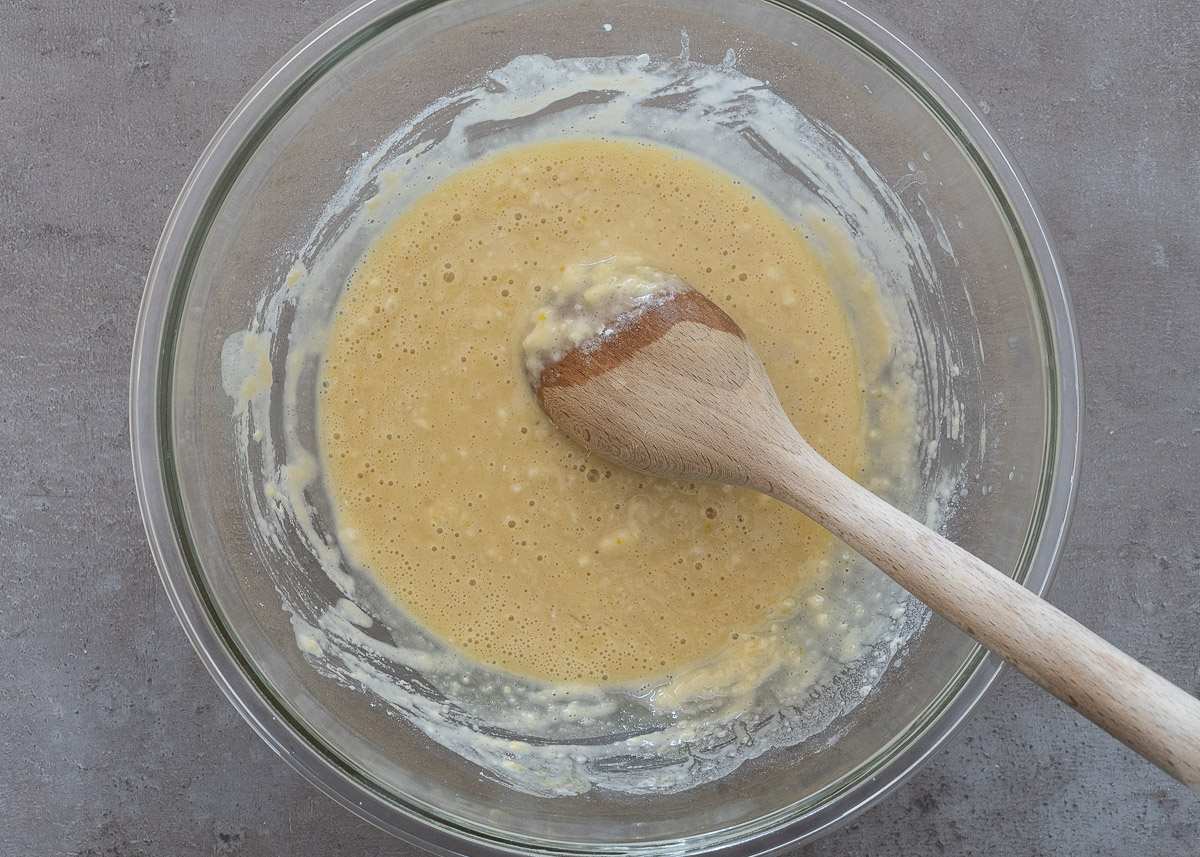 - Incorporamos la masa de arranque reservada, las yemas de huevo, la leche templada y la mezcla de cítricos y miel que habíamos reservado.