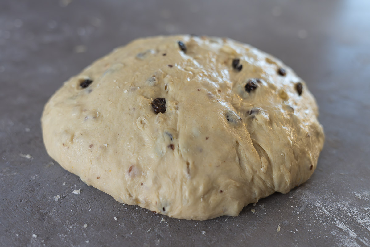- Una vez la masa ha duplicado su tamaño, la colocamos en una superficie ligeramente enharinada y la amasamos brevemente. Ahora es cuando podemos añadirle las frutas confitadas, las pasas o si lo preferimos pepitas de chocolate.