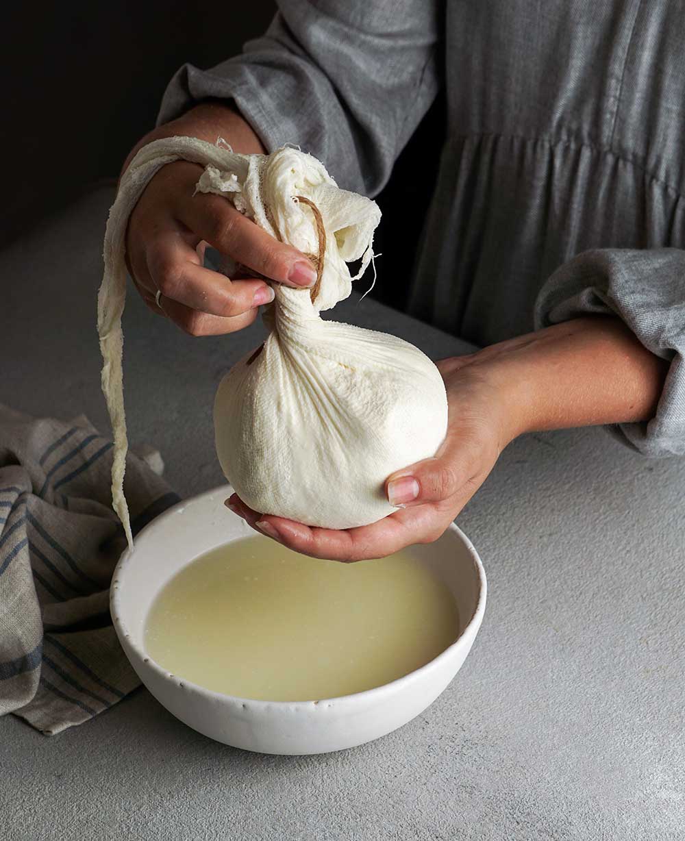 - Para eliminar bien el suero unimos las esquinas de la malla de algodón formando una especie de hatillo, y apretamos delicadamente para que escurra bien el líquido. Cuanto más apretemos más seco quedará el requesón, así que os aconsejamos ir controlando para que os quede en el punto deseado de cremosidad.