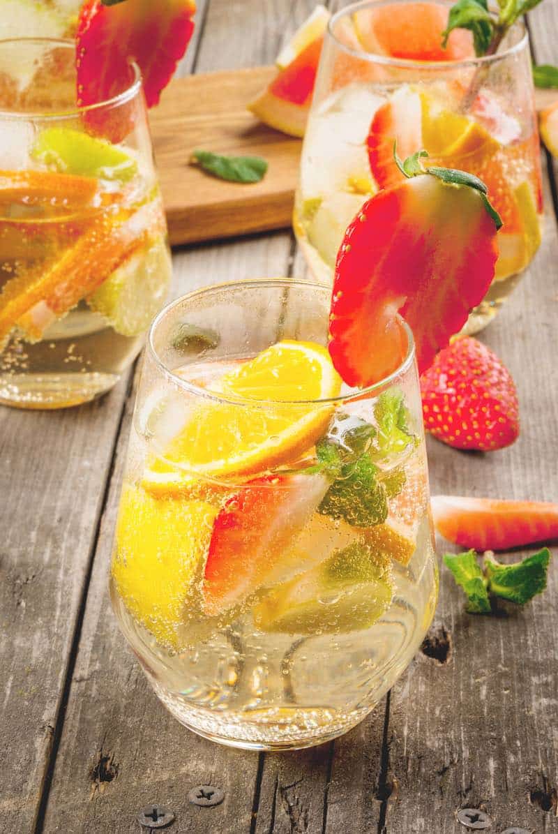 Ingredientes: 1 botella de vino blanco ligero (750 ml); 1 melocotón; 1 manzana; 1 kiwi; 1 pera; 1 lata (330 ml) de refresco de limón o naranja; un chorrito de cointreau o coñac; 1 cucharada de azúcar.