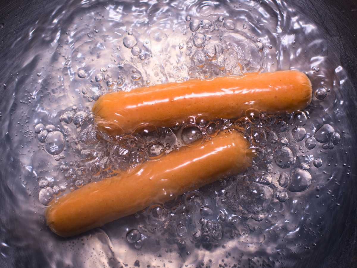 - Cocina las salchichas en agua hirviendo durante unos 5-7 minutos hasta que estén bien calientes.