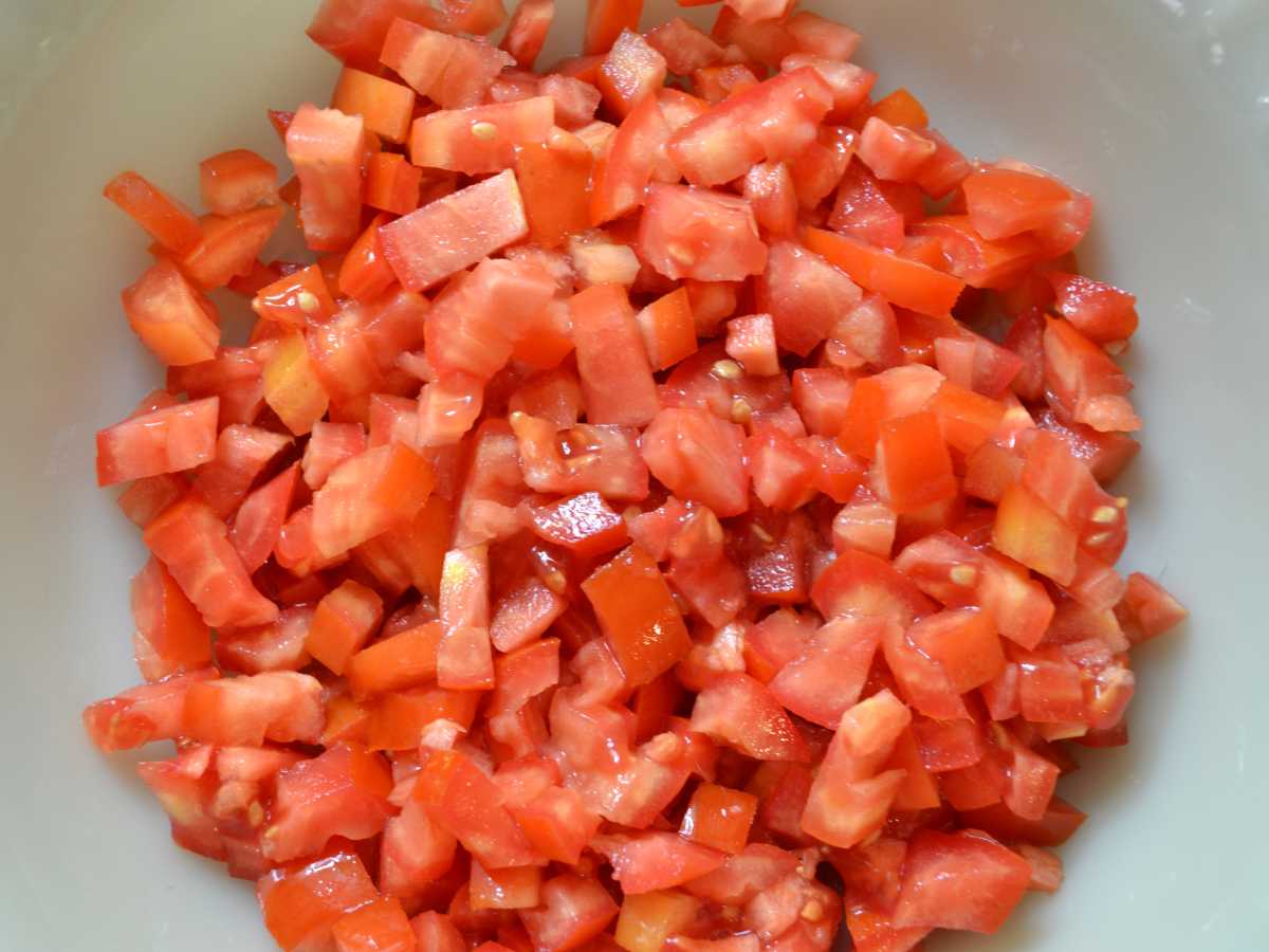 - Pica el tomate en cuadraditos pequeñitos (brunoise)