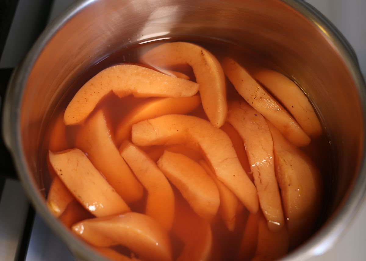 - Lleva la olla a fuego medio y revuelve para que el azúcar se disuelva y se mezcle bien con los membrillos y las especias.