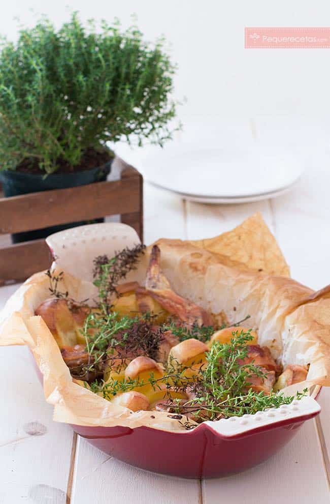 - Con el horno precalentado 180°C incorporamos la fuente y horneamos durante 30-40 minutos, el conejo tiene que estar dorado.