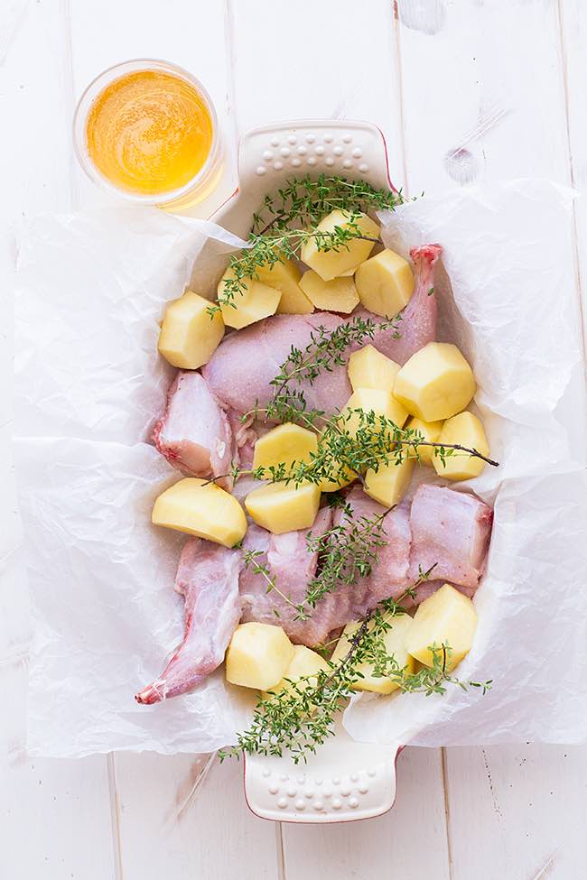 - En una fuente apta para horno disponemos el medio conejo, las patatas, el diente de ajo en láminas repartido por la fuente, un buen chorro de aceite de oliva, sal, pimienta, tomillo fresco y regamos con la cerveza sobre el conejo.