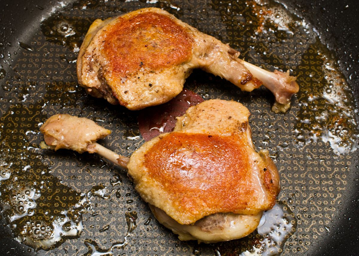 - Dorar los muslos de pato: En otra sartén, calentamos un poco más de grasa de pato a fuego medio-alto. Colocamos los muslos confitados con la piel hacia abajo y los cocinamos unos 3-5 minutos, hasta que la piel esté dorada y crujiente. Esto también calentará el pato por dentro sin perder la textura crujiente de la piel.