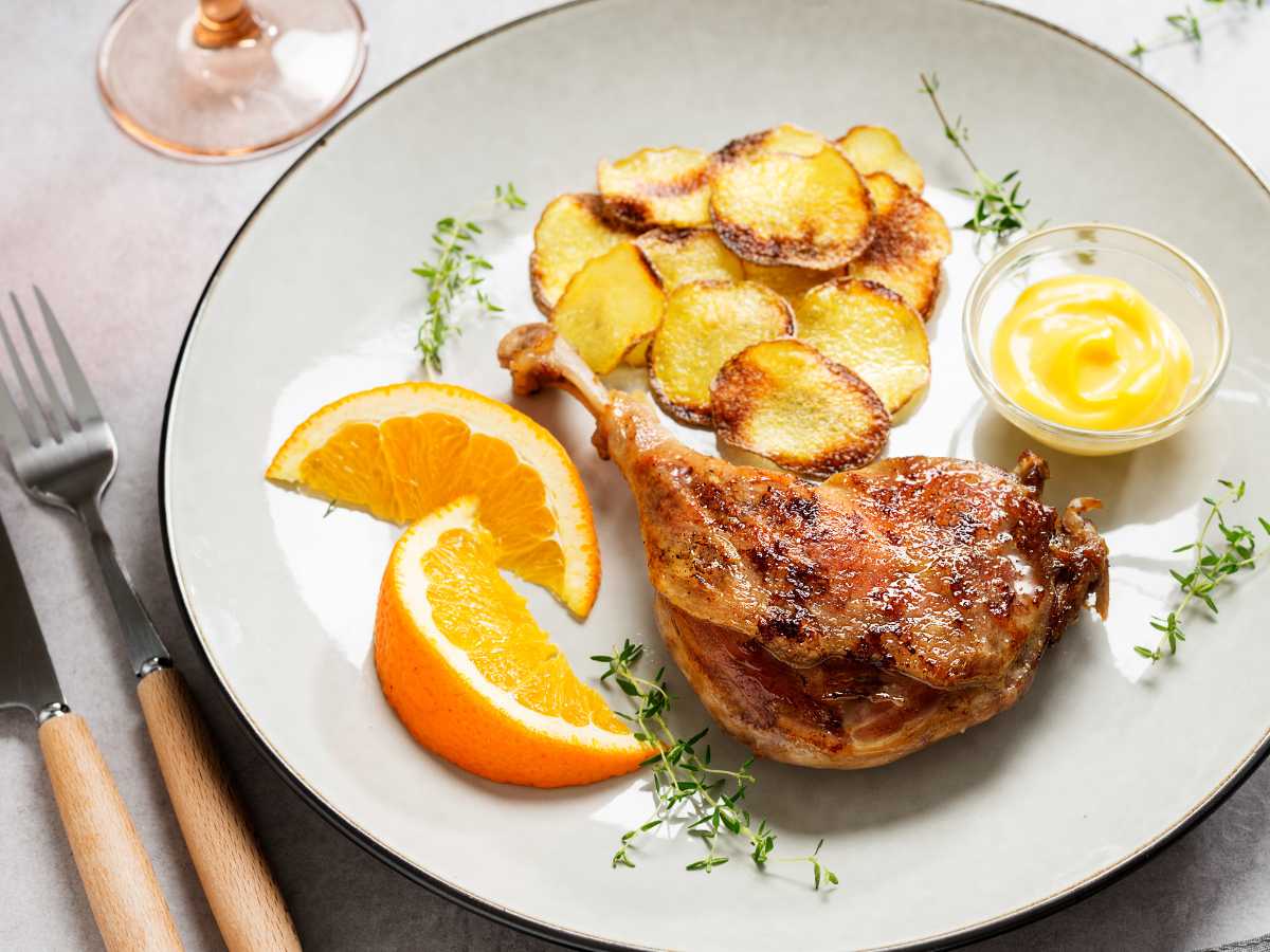 - Servir: Emplatamos los muslos de pato crujientes con las rodajas de naranja y las patatas doradas en grasa de pato. Podemos decorar con un poco de tomillo fresco.