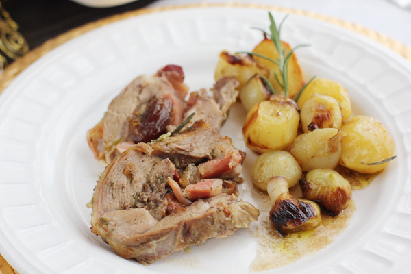 - En el hueco del hueso ponemos los dátiles (sin hueso) y tiras de jamón (mejor que sea jamón con tocino).