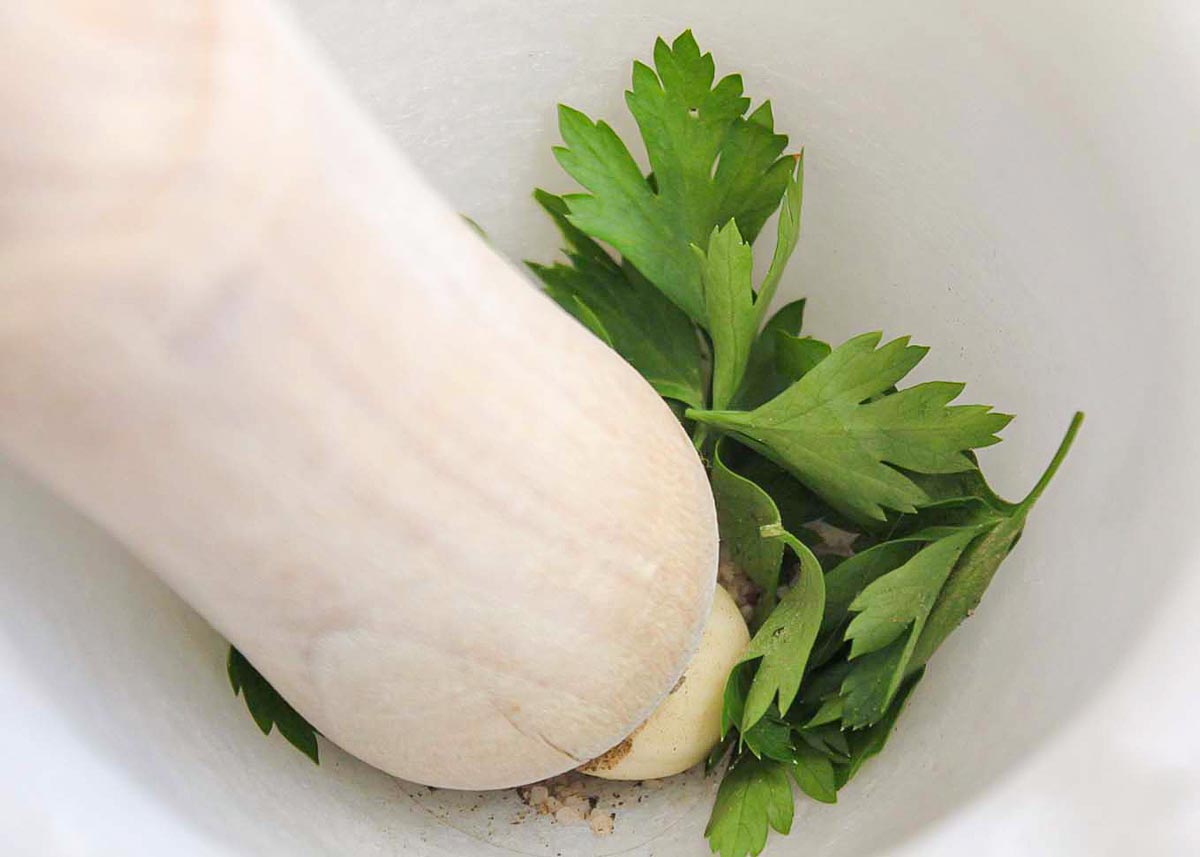 - Machacamos en el mortero sal, ajos, perejil y pimienta negra, y con este majado untamos bien la carne por todos lados.