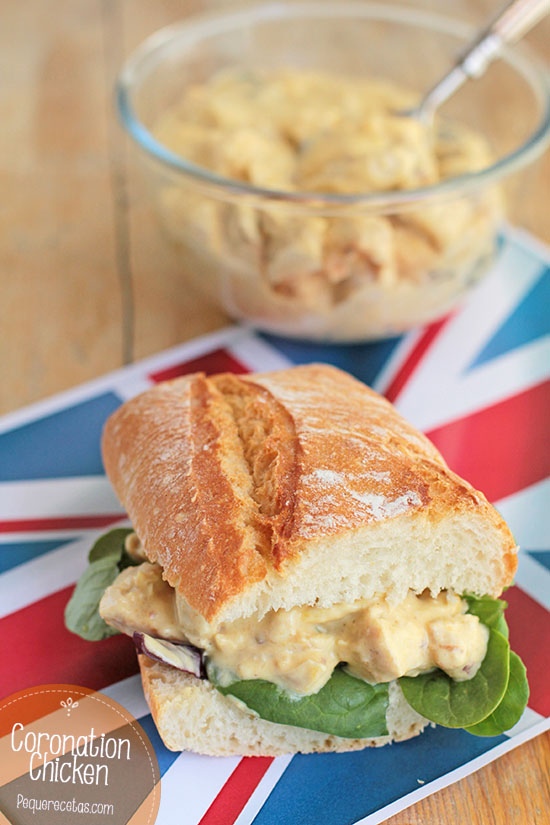 En casa nos gusta muchísimo y al ser un plato frío, es perfecto para llevarlo en una fiambrera si tenemos que comer fuera. Podéis servirlo tal cual, acompañado por ejemplo de un arroz salteado, pero es muy típico utilizarlo como relleno de recetas de sándwich o bocadillos y así nos lo hemos comido en casa. Espero que os guste y que os animéis a preparar en casa la receta de Coronation Chicken o Pollo de la Coronación.