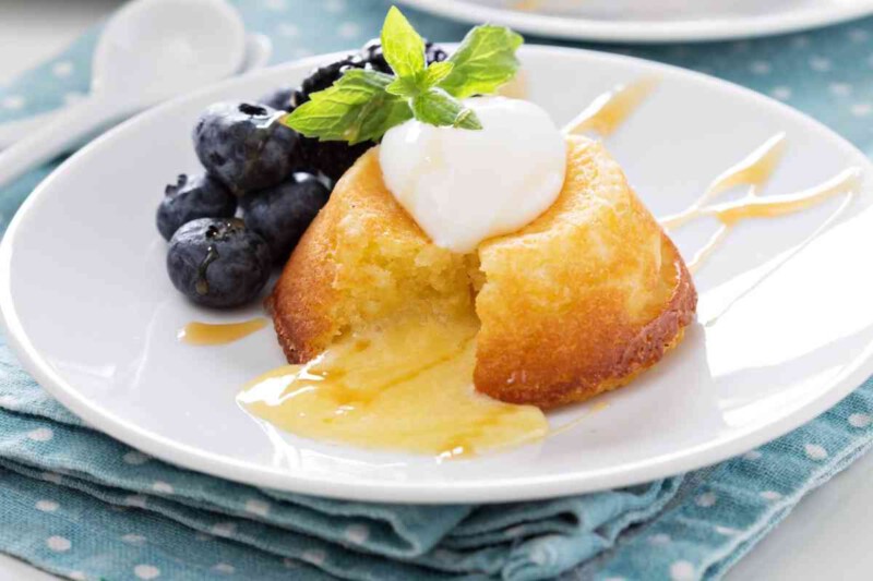 Hay que tomarlo inmediatamente, caliente, por lo que podéis acompañarlo de una bola de helado (prueba nuestro helado de vainilla casero), el contraste de frío y caliente será espectacular. También puedes servirlo sobre unas natillas caseras o acompañarlo de unos frutos rojos como hemos hecho nosotros con estas grosellas, en boca todo un placer.