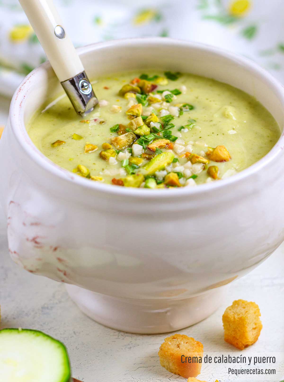 Esta crema de puerros está deliciosa si la coméis sin más, pero si queréis añadirle algún tipo de tropezones podéis poner unos picatostes de pan frito con ajo, que le dan un sabor delicioso. O como hemos hecho nosotros en este caso, le podéis añadir unos pistachos y cubitos de almendra picados o cualquier fruto seco, espolvoreando cebollino por encima.