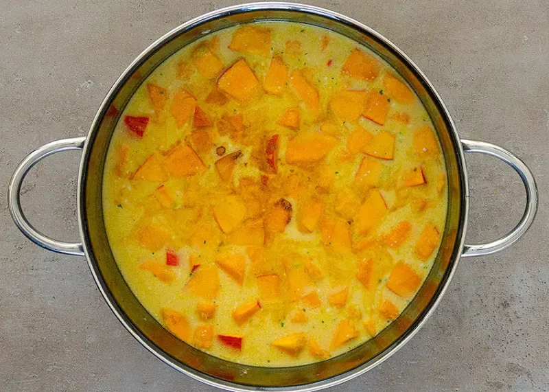 - Vierte la leche de coco y el caldo de verduras en la olla. Lleva la mezcla a ebullición y luego reduce el fuego a medio-bajo. Cocina a fuego lento durante aproximadamente 20-25 minutos, o hasta que la calabaza esté tierna.
