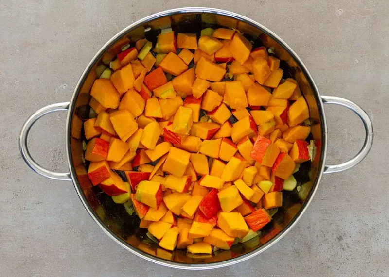 - Añade los cubos de calabaza a la olla y saltea durante unos minutos hasta que estén ligeramente dorados.