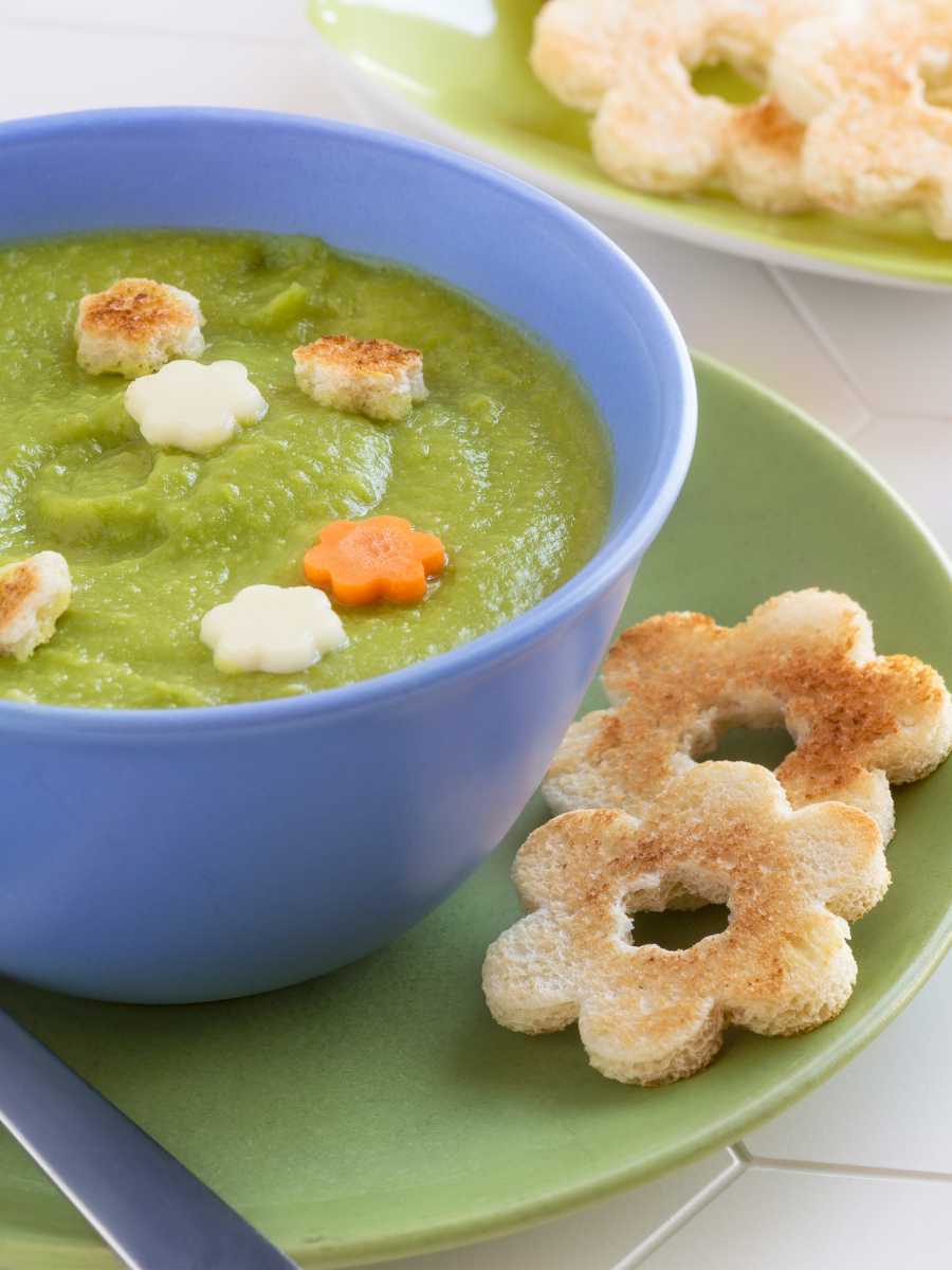 - Sirve la crema tibia. Es perfecta para bebés y niños, y puedes acompañarla con pequeños trozos de pan como en la imagen, en la que se ha utilizado un cortapastas para cortar pan de molde tostado, y pequeños trocitos de zanahoria cocida y queso.