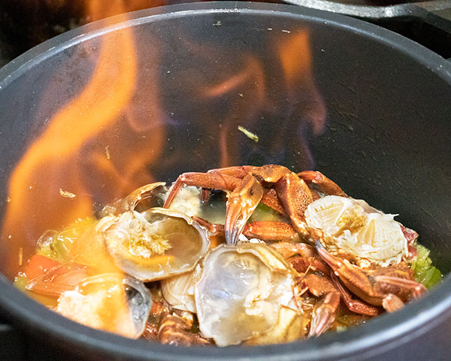 - Incorporamos el brandy y flambeamos, con cuidado y la precaución de apagar en ese momento el extractor.