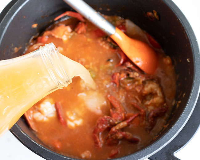 - Para conseguir que nos den todo su sabor, abrimos las nécoras, separando el caparazón superior, lo ponemos todo en la cazuela.