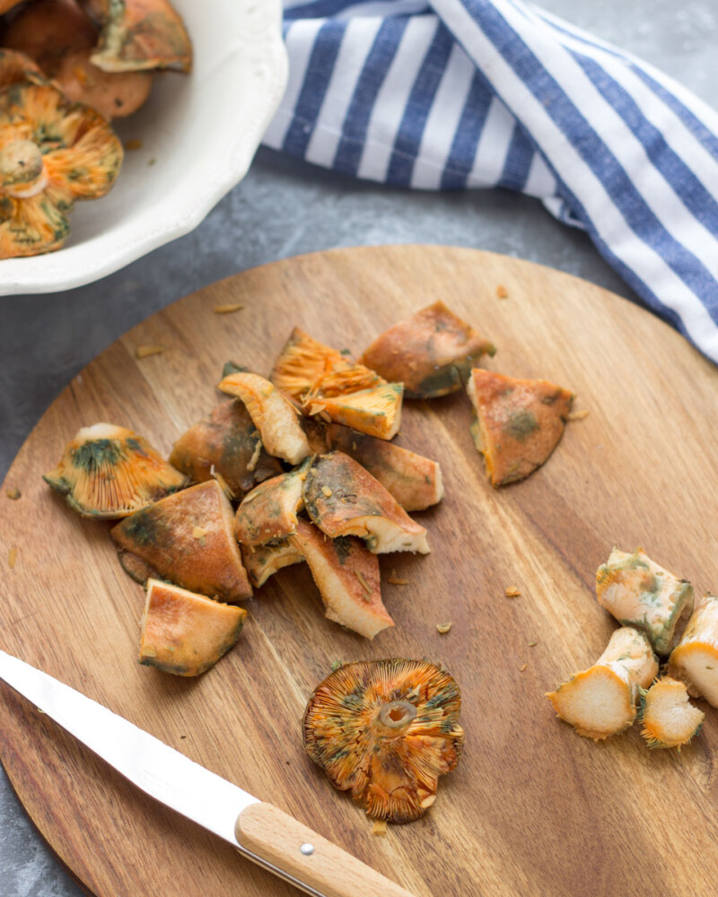 - Corta los níscalos en trozos medianos, reservando algunos enteros para la decoración final si lo deseas.