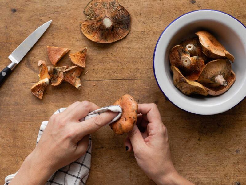 - Comienza limpiando los níscalos con un paño húmedo para eliminar cualquier resto de tierra. Si están muy sucios, puedes pasarlos rápidamente por agua, pero sécalos bien después para que no absorban humedad en exceso.