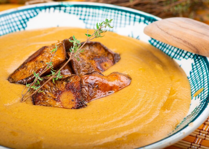 - Sirve la crema caliente, decorando con los níscalos salteados y unas hojitas de tomillo fresco para dar un toque aromático y visual.