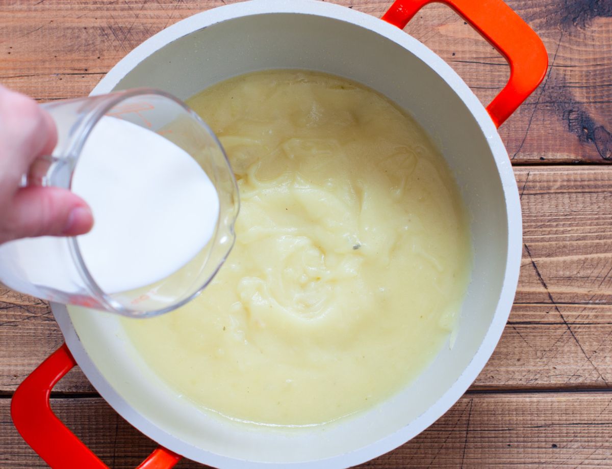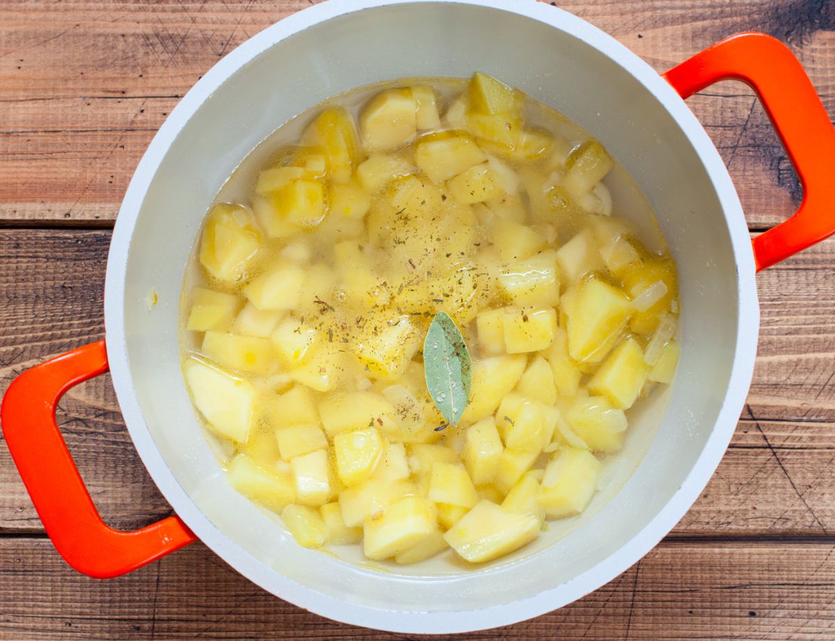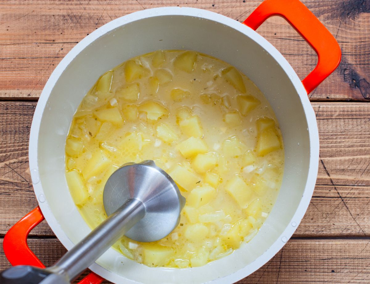 - Cuando las patatas estén cocidas, retiramos la cazuela del fuego y trituramos con la batidora hasta obtener una textura lisa y suave.