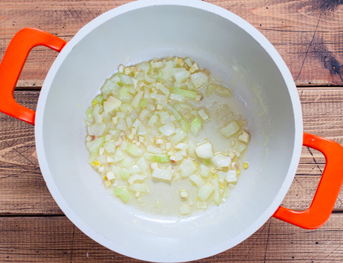 - Incorporamos la cebolla y el ajo picados y doramos a fuego suave, removiendo de tanto en tanto.