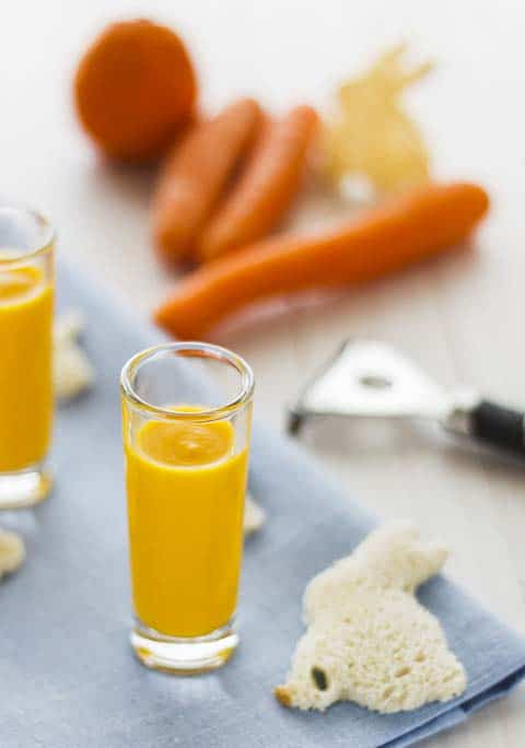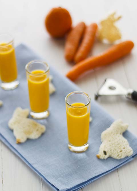 La crema de zanahoria y naranja se puede acompañar de muchas formas para añadir un toque visual y divertido a tu plato. Por ejemplo aquí la hemos acompañado de pan tostado en forma de conejitos (los hemos cortado con unos cortadores de galletas como éstos). Además los servimos en vasos de chupitos, para que resulte un aperitivo perfecto antes de comenzar cualquier comida ¡a los niños les encantará esta puré de zanahoria!