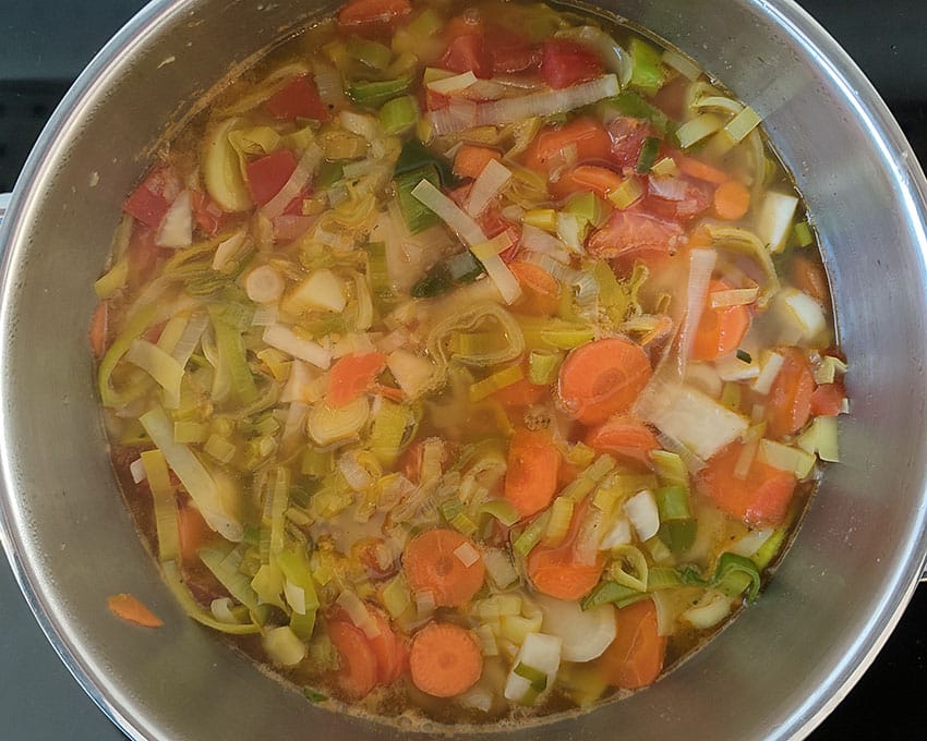 - Añadimos aproximadamente un litro de agua, lo necesario para cubrir con agua las verduras, y cocemos durante unos 20 minutos