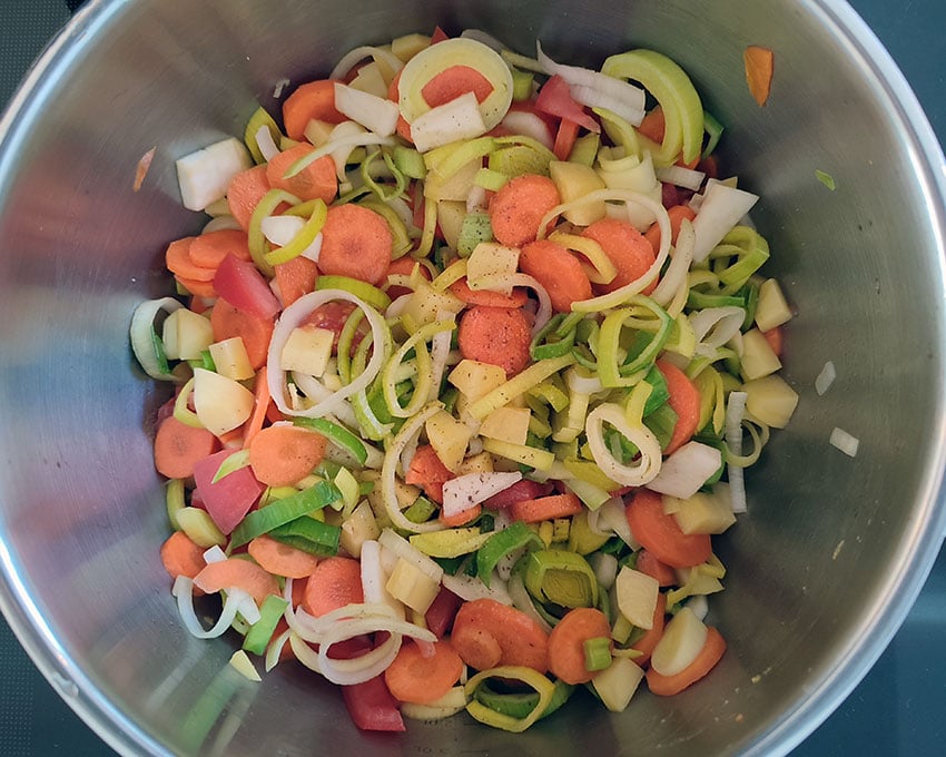 - Lavamos, pelamos y cortamos las verduras. Recordad que cuanto más gruesos los trozos menos vitaminas y minerales perderán.