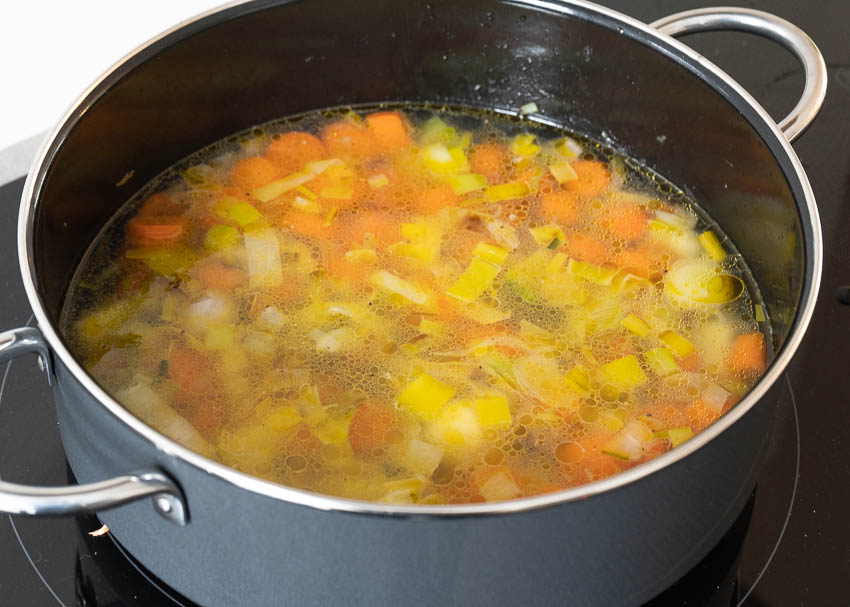 En una olla grande ponemos un poco de aceite de oliva y salteamos las verduras durante unos 5 minutos. A continuación, añadimos un litro y cuarto de agua, la sal y la pimienta y lo llevamos a hervir. Una vez comience a hervir, bajamos el fuego a medio y lo dejamos durante unos 20 minutos hasta que las verduras se hayan ablandado.