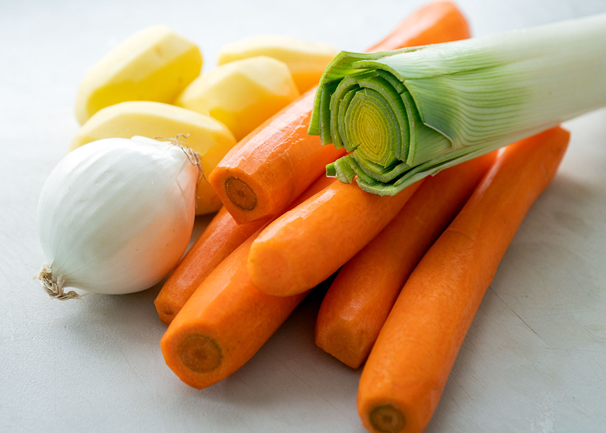 Para hacer nuestra crema de zanahoria lo primero que haremos es limpiar bien las zanahorias, las patatas y el puerro bajo el grifo y seguidamente las secamos bien.