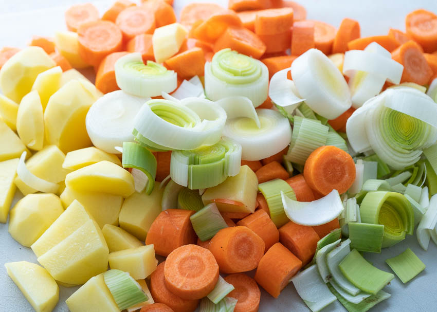 Seguidamente, pelamos las patatas y las zanahorias y las cortamos en cubos procurando que sean aproximadamente del mismo tamaño. El puerro lo cortamos en rodajas y la cebolla la pelamos y la cortamos finamente.
