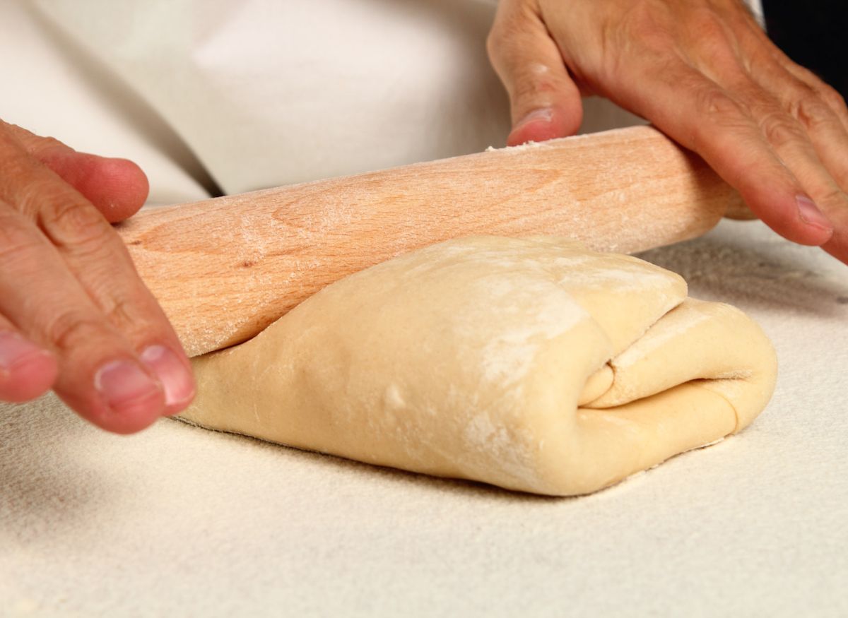 - Estiramos la masa, debe hacerse con cuidado, es decir, estiramos con el rodillo pero sin presionar demasiado, ya que entonces se rompería la masa y se nos saldría la mantequilla.