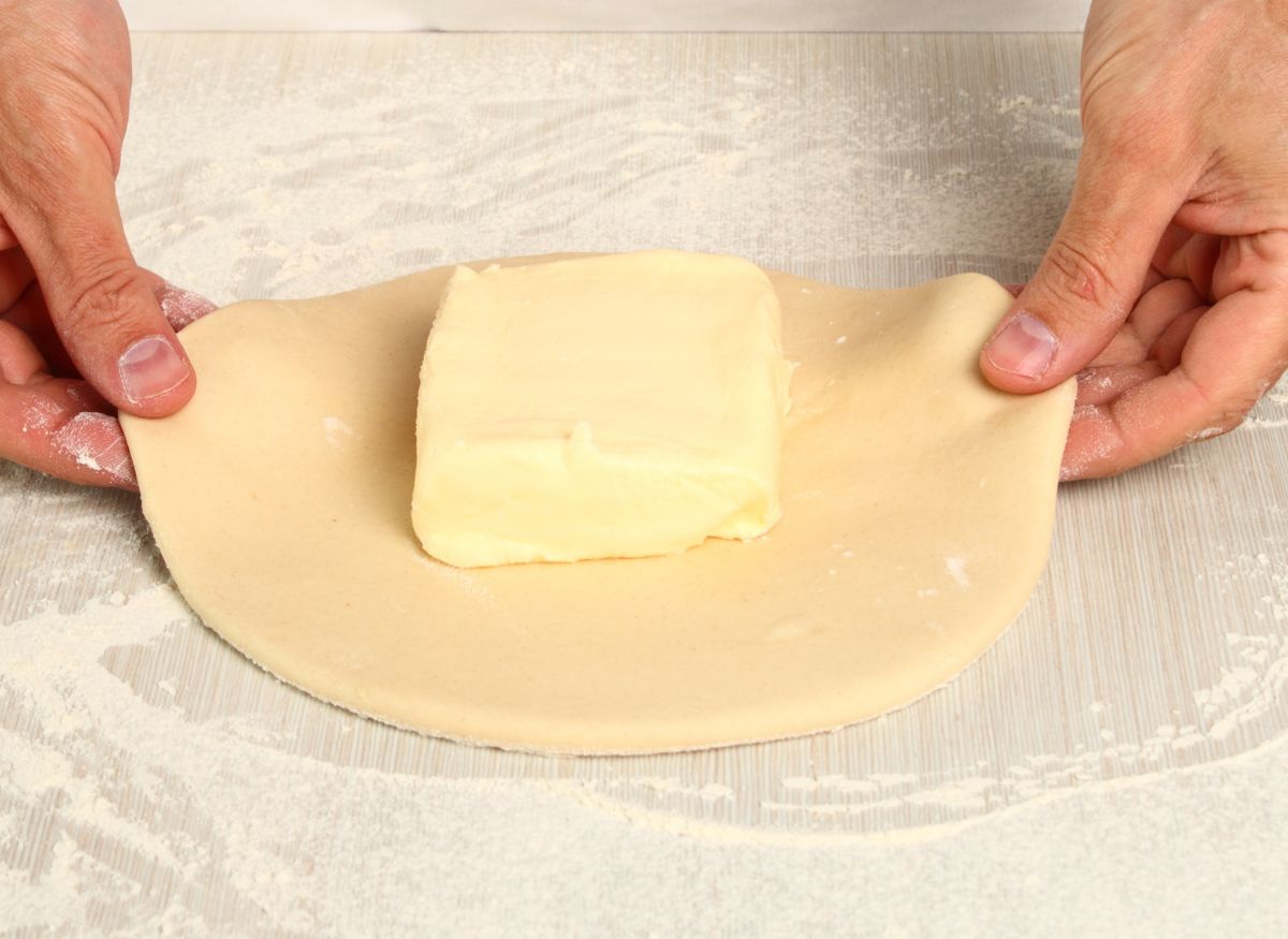 - Sacamos la masa de la nevera, ponemos en la encimera, que espolvoreamos con un poco de harina, y encima colocamos la mantequilla, intentando que quede centrada.
