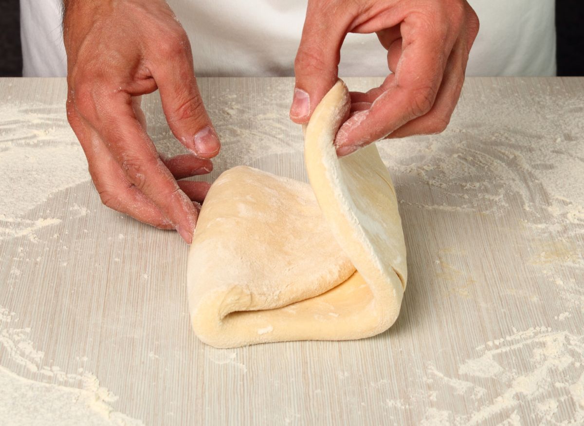 - Tenemos que hacer esta operación tres veces, cada vez que vayamos a estirar la masa, la giramos, es decir…si tenemos la masa en dirección vertical, la ponemos en horizontal. Mi truco, para acordarme, es que la guardo en la nevera en la posición en la que tengo que amasar.