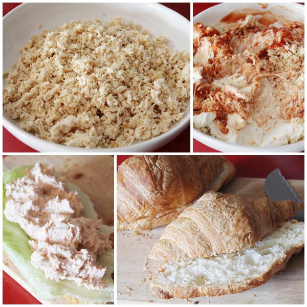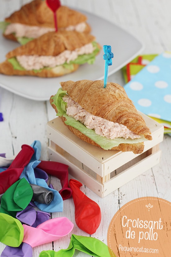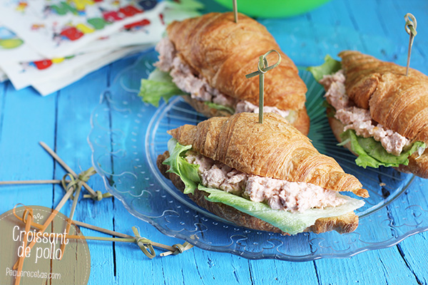 - Abrimos los croissants por la mitad, ponemos una o dos hojas de lechuga, encima el relleno de pollo, tapamos con la otra parte del croissant y listos.