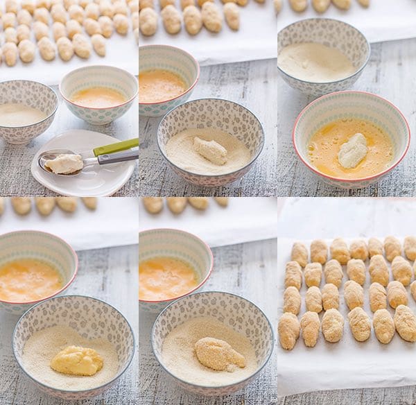 - Cogemos la cantidad de una cuchara de la masa, damos forma con dos cucharas y luego rebozamos en huevo batido primero y en pan rallado después.