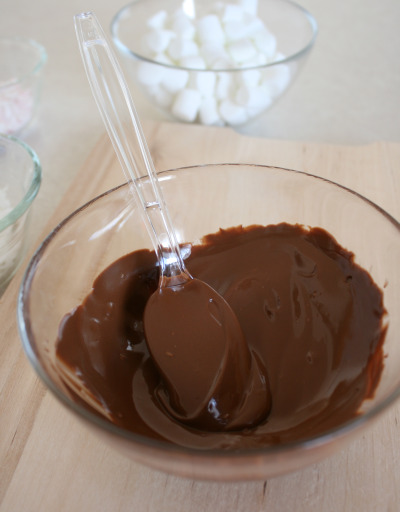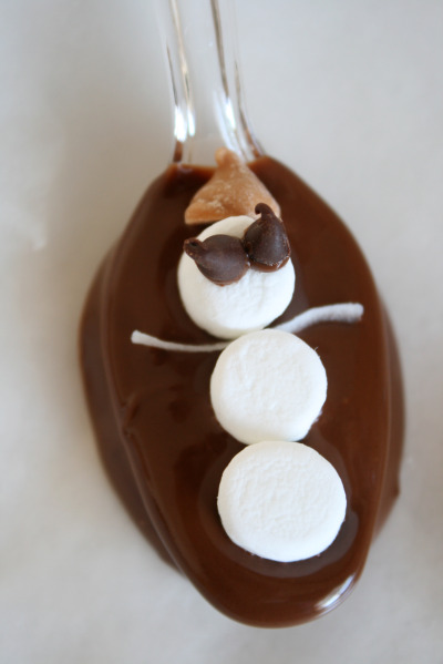 Una vez cubiertas de chocolate las cucharas es el momento de decorarlas. Para el muñeco de nieve alinea 3 nubes pequeñas en la cuchara. Poner un poco de matequilla de cacahuete para el sombrero y una hebra de coco para la bufanda. Luego, se puede coger algo del chocolate derretido y ponerlo en una jeringuilla para realizar los ojos. ¡Perfecto!