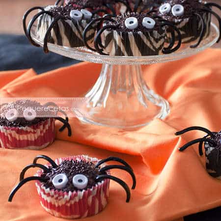 Como ves, estas pequeñas tartas dan mucho juego. Puedes decorarlas como se te ocurra y siempre lucirán apetitosas… En este caso, las hemos transformado en arañas. El cupcake es de vainilla y hemos decorado con crema de avellanas y cacao, sprinkles y caramelos. ¡Anímate a jugar con tu imaginación!