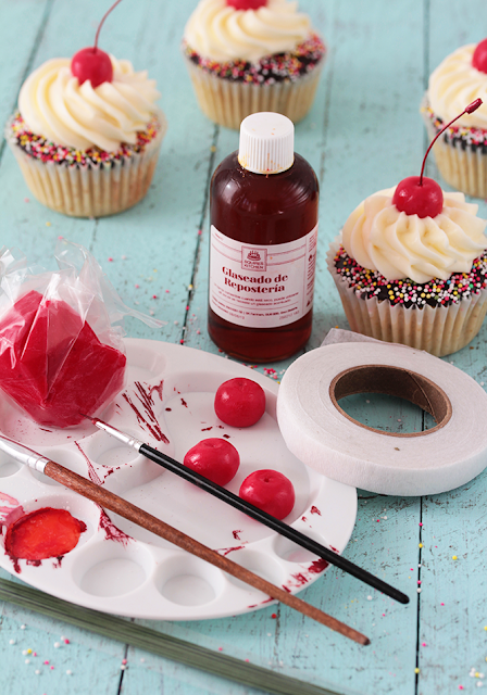 - Yo no tenía cerezas, así que las “fabriqué” con fondant rojo, barniz alimentario (para darle brillo) y alambres (de los que se usan para las flores de pasta de azúcar) pintados con colorante alimentario.