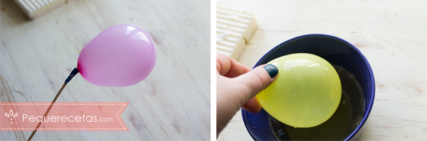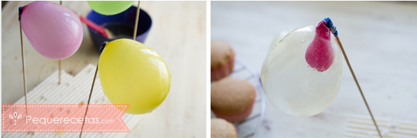 - Ahora viene la parte divertida. Cogemos cada globo y lo sumergimos en la gelatina, girándolo para que cubra bien toda la superficie, menos la parte más cercana a la atadura.