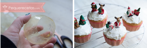 - Untamos los cupcakes con una capa abundante de crema, colocamos la figurita y ponemos por encima el globo de gelatina.