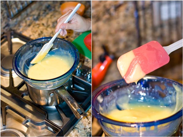 Mezclar hasta llegar a punto de nape, es decir, hasta que esté espeso y al pasar el dedo por el dorso de la paleta éste la deje limpia sin que se unan los bordes.