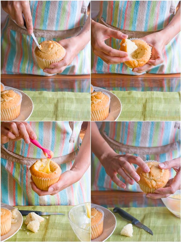 Para armar los cupcakes, hacer un corte en diagonal sobre la tapa del mismo para extraer un cono de tarta. Rellenar con crema de limón y tapar nuevamente (también puede recortarse parte del cono y dejar solo la tapa, así les cabe más crema, jummm)