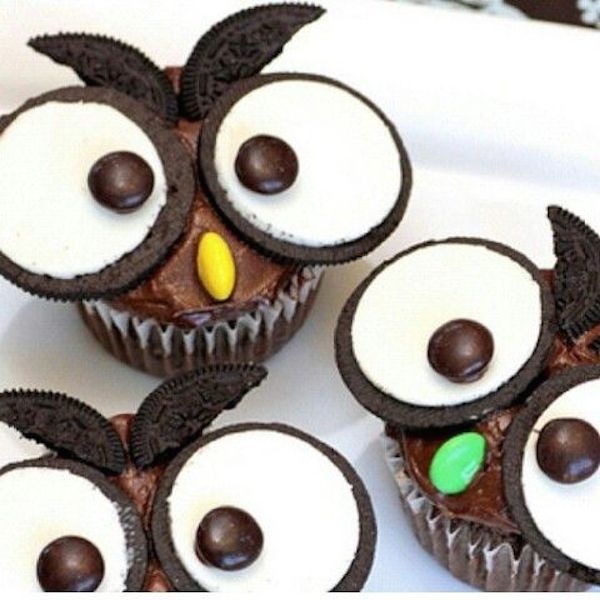 Con la receta de los cupcakes de chocolate podemos hacer estos divertidos búhos. Los ojos son galletas mini oreo abiertas, con un lacasito o una chispa de chocolate para hacer la pulila. Las cejas son un trozo de oreo y el pico cualquier lacasito o chuche con forma alargada.