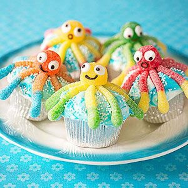 Para hacer estos cupcakes ideales para fiestas de tema marino, por ejemplo una fiesta de La Sirenita, solo tenemos que colorear nuestra crema con unas gotas de colorante azul. Ni siquiera necesitamos manga, nos bastará una espátula para distribuir un poco de crema sobre cada magdalena. Los pulpos están hechos con gominolas, una gominola a forma de cono para el cuerpo, y otras tipo gusanillo para los tentáculos. Los ojos de azúcar y los tubos de glasa de chocolate para hacer la boca se venden en tiendas especializadas.