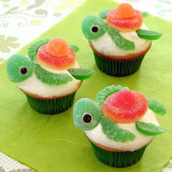 Para hacer estos cupcakes de tortuguitas vale lo mismo que hemos dicho para los anteriores de pulpos. Toda la decoración está hecha de gominolas, seguro que en las tiendas de chuches encontráis muchas formas y colores diferentes que os servirán para decorar vuestros cupcakes.