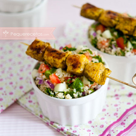 El cuscús es muy fácil de preparar, incluso lo podéis conseguir precocinado en supermercados. Por eso, nos ha encantado la idea de preparar una rica ensalada con cuscús ¡acompañada de pinchitos de pollo! ¿No os parece una deliciosa combinación?